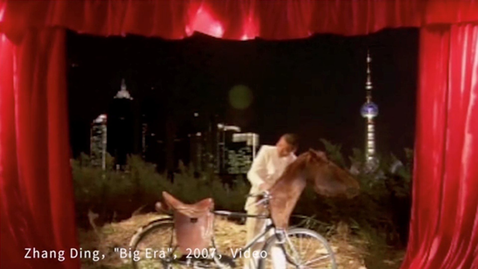 Nuestro “príncipe azul”, un hombre vestido de blanco, subió al escenario. Montó en una bicicleta con una cabeza de caballo acolchada y una silla en la canasta, y desapareció en la noche. Esta película se realiza en una serie de escenarios: el caballero siempre regresa a una encrucijada vacía. En este video, Zhang Ding utiliza el estilo cinematográfico de Fellini para comparar los ideales y la realidad de los miles de trabajadores migrantes que han llegado a Shanghai. Estas personas han dejado sus lugares de origen para venir a esta ciudad en busca de oportunidades para hacer una fortuna. El artista revisó el gran impacto del proceso de modernización de China y expresó su gran simpatía por la difícil situación de los trabajadores migrantes que llegaron a la ciudad en busca de una vida mejor.