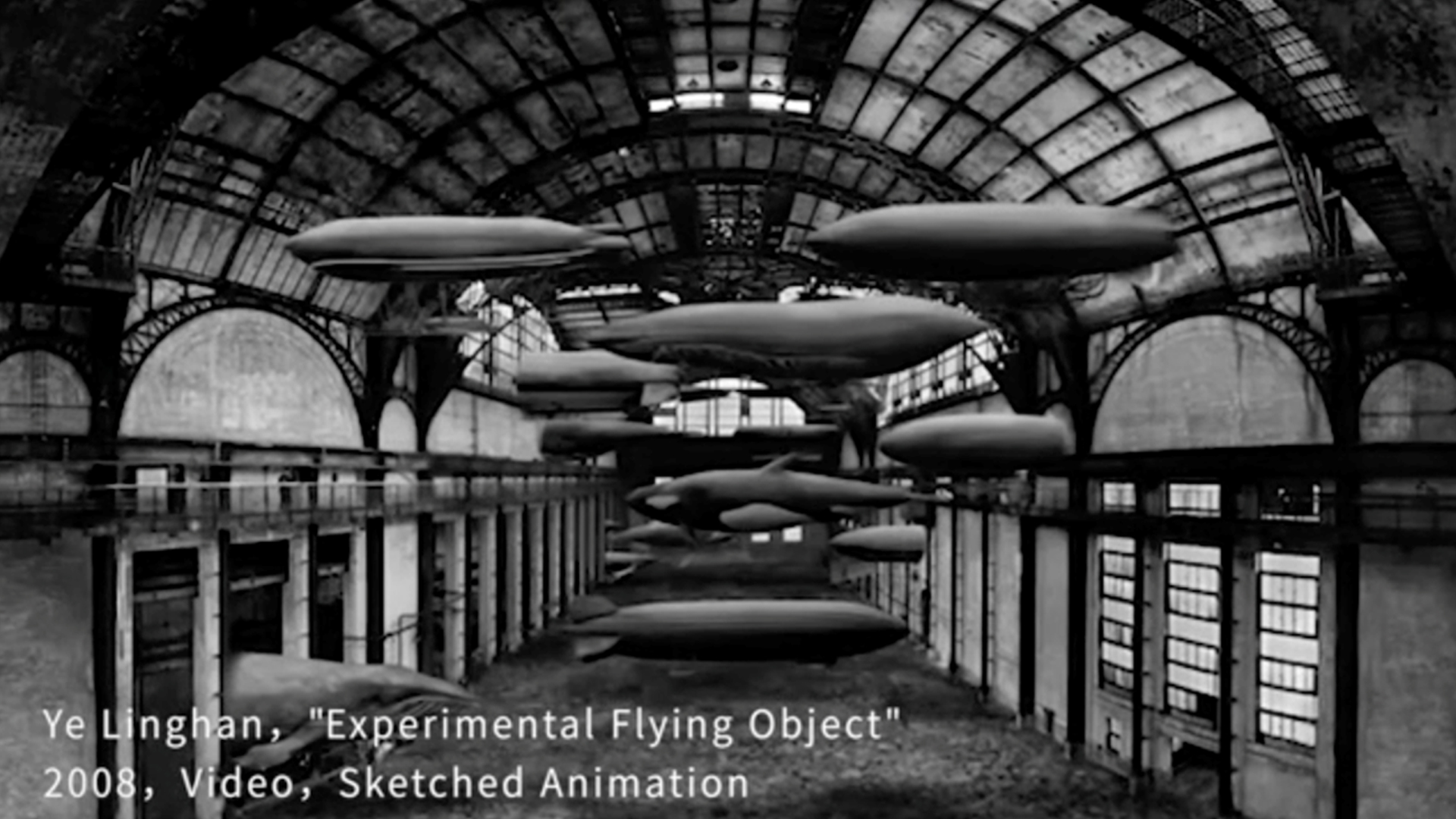 Este es un vuelo de prueba de una aeronave ballena y algunos objetos desconocidos. La fábrica de la “desintegración” es un espacio por el que vuelan. El artista captó 7 minutos y 23 segundos del largo vuelo de prueba de la aeronave, tratando de representar el mundo mítico del universo donde hay cosas que no son los párpados de las personas.